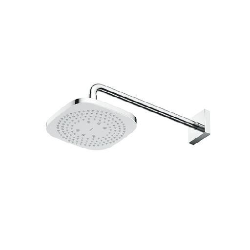 رأس دش مربعة تجمع بين الأناقة والوظيفة بتصميم أبيض وكروم. تمنح تدفق ماء سلس وعمود جانبي أنيق للحمامات العصرية.